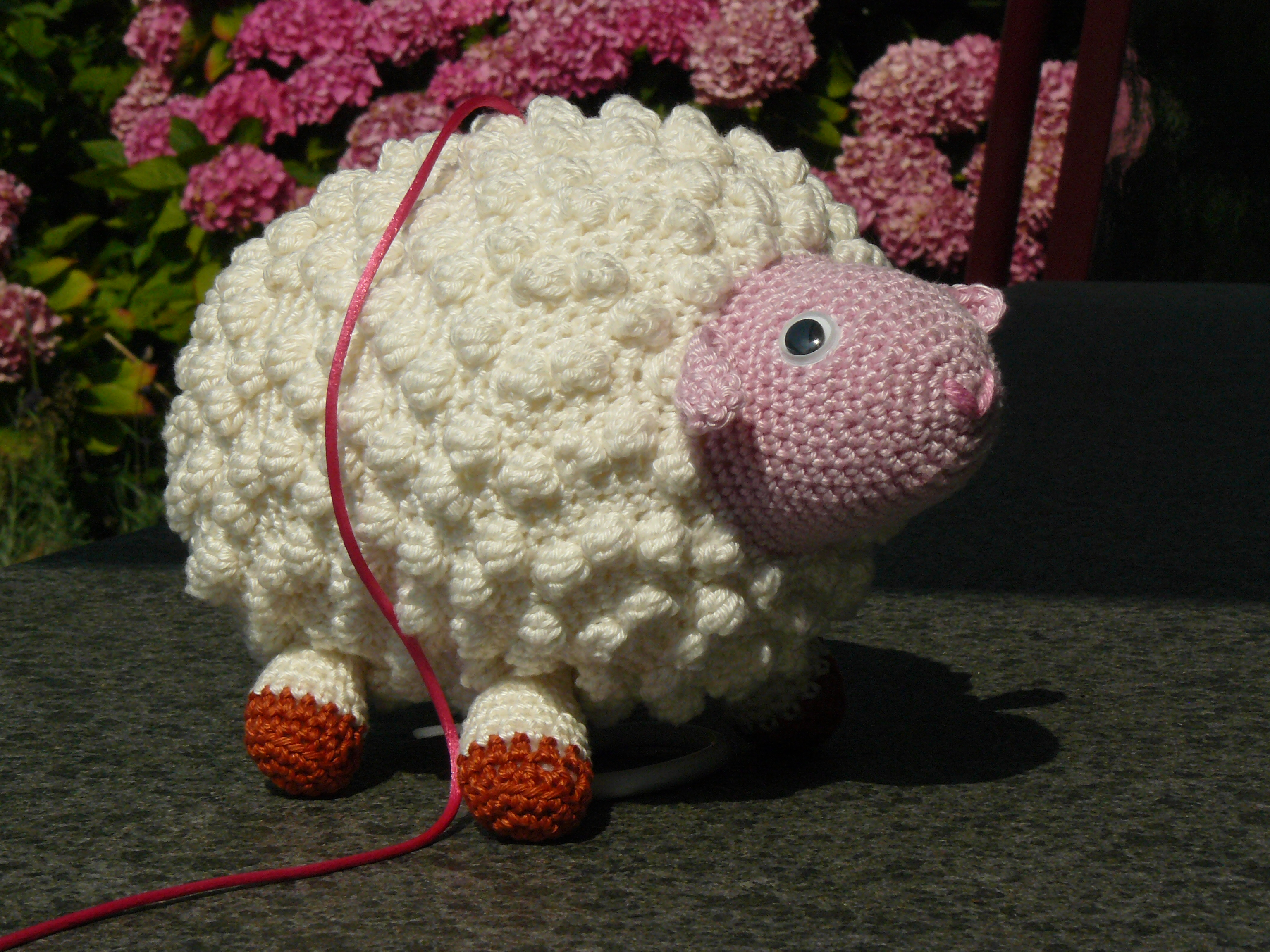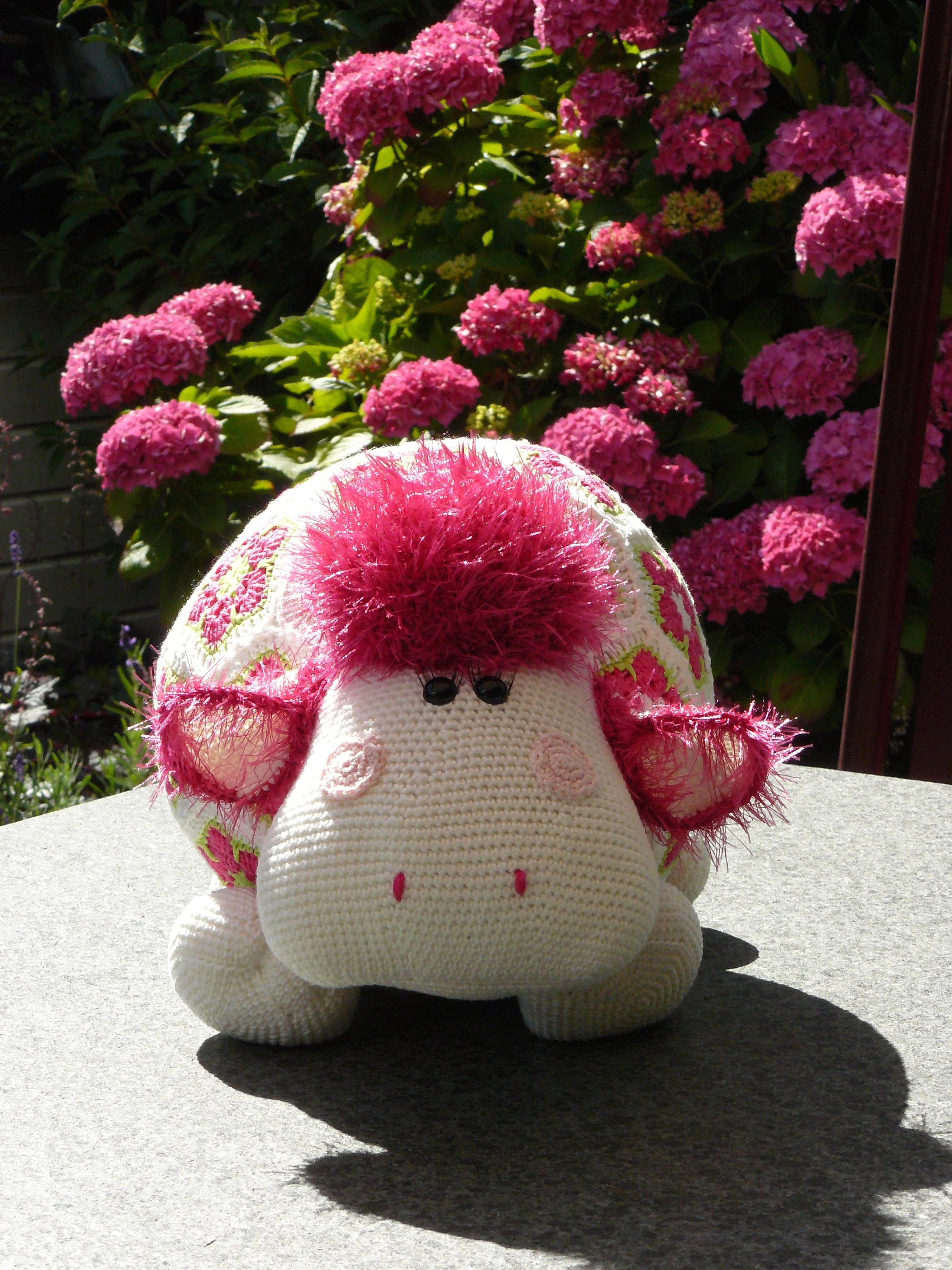 Je haakt heel veel bloemen om daarmee zijn lijf te maken. Kop, oren, staart, poten en kuifje op de normale manier en dan in elkaar zetten. Een hele klus maar wel leuk.