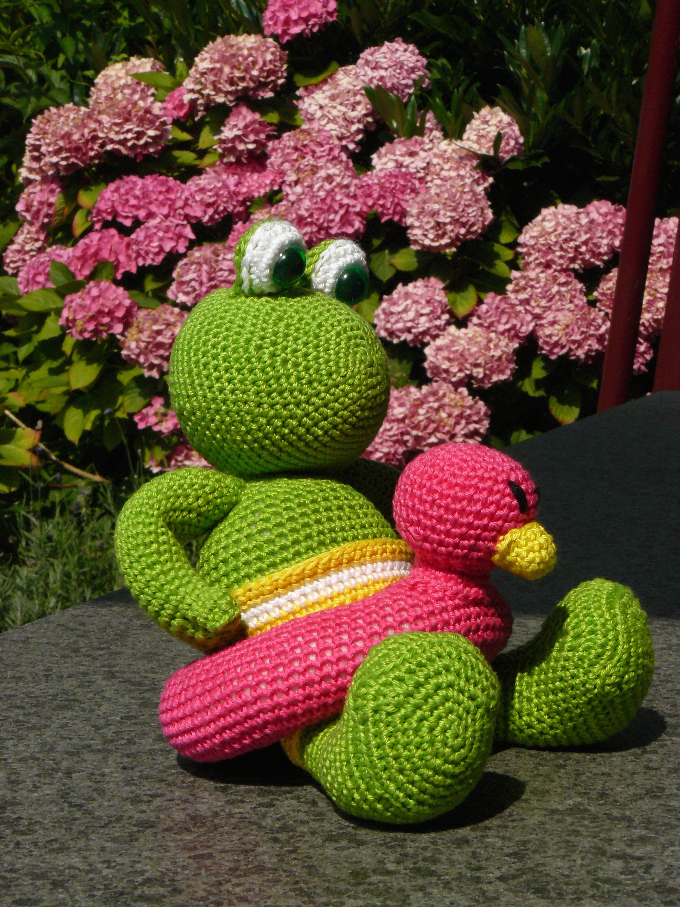 Mijn Belgische collega krijgt over een paar maanden haar eerste kindje. Dit was haar wens… een kikker met zwemband. Hopelijk gaat haar baby er lang mee kunnen knuffelen. De kleuren moesten fel zijn. Met een restant fuchsia van het schaap Veronica is de zwemband gemaakt. Hopelijk fel genoeg..