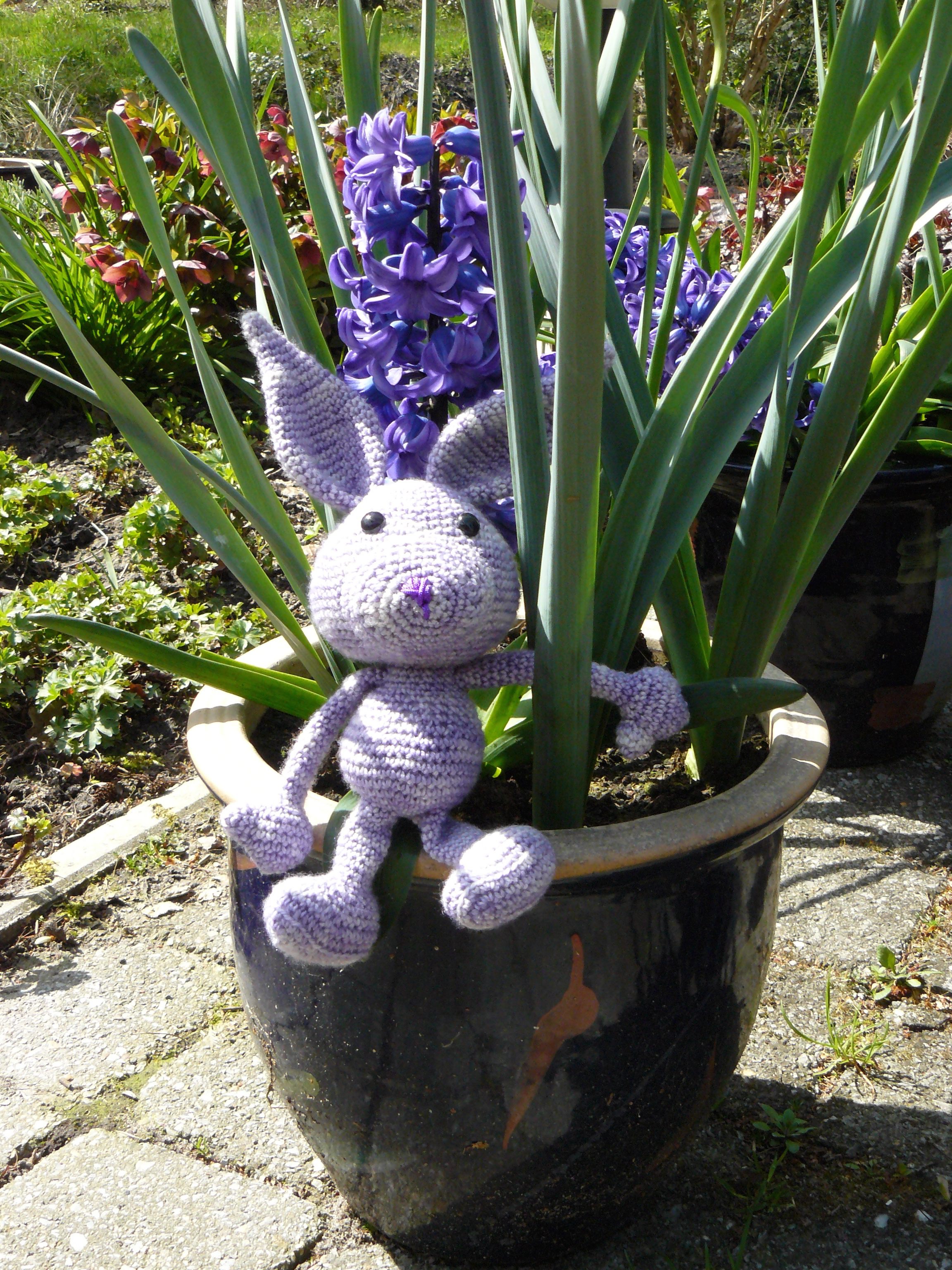 Tot nog toe heb ik alleen met katoen gewerkt. Voor de kerst kreeg ik een paar strengen wol vanuit Amerika die onze dochter had meegenomen. Omdat er paars gemeleerd bij was hiervan Lenny gemaakt. Het kinderziekenhuis Sophia heeft dan ook een Lenny om weg te geven. Hij is heel zacht geworden en ook wat kleiner. De wens was voor kleine knuffels dus dat komt dan mooi uit. Verder nog een rammelaar voor ze gemaakt maar weer wel in katoen.